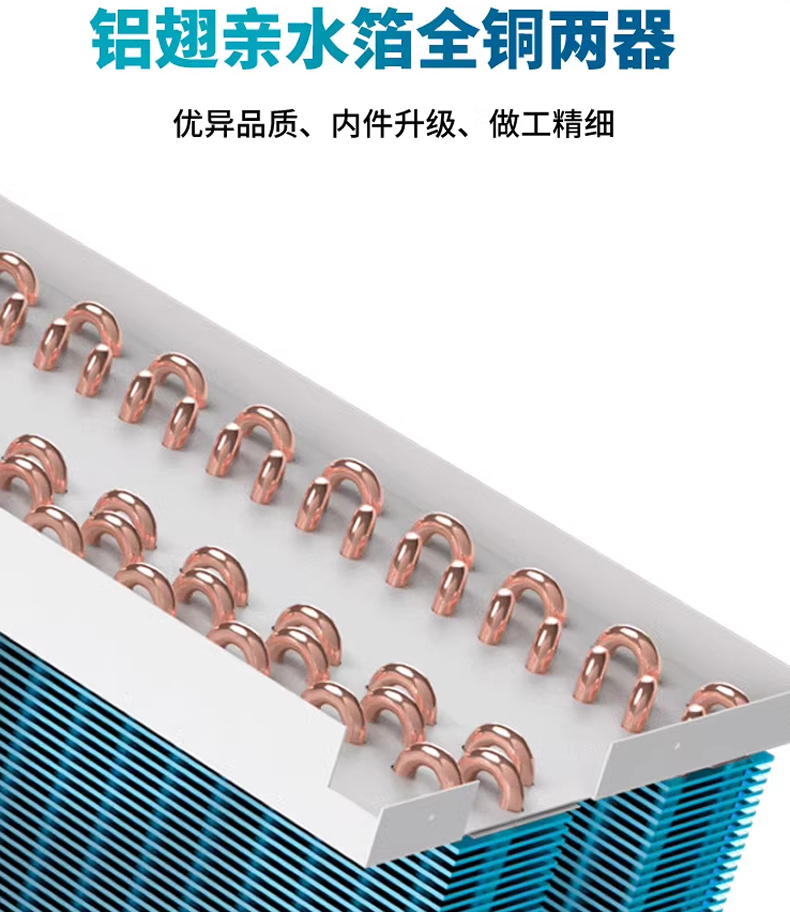 鋁翅親水膜 ,冷凝器/蒸發器,防污漬清潔能力,0.1mm親水鋁箔材料,快速冷凝,效率大幅度提升,內螺紋銅管,大大提升了系統能效